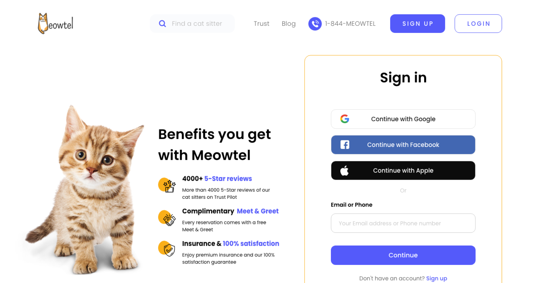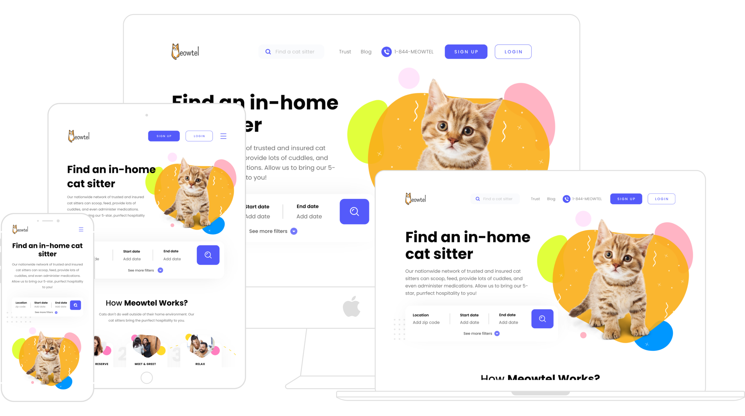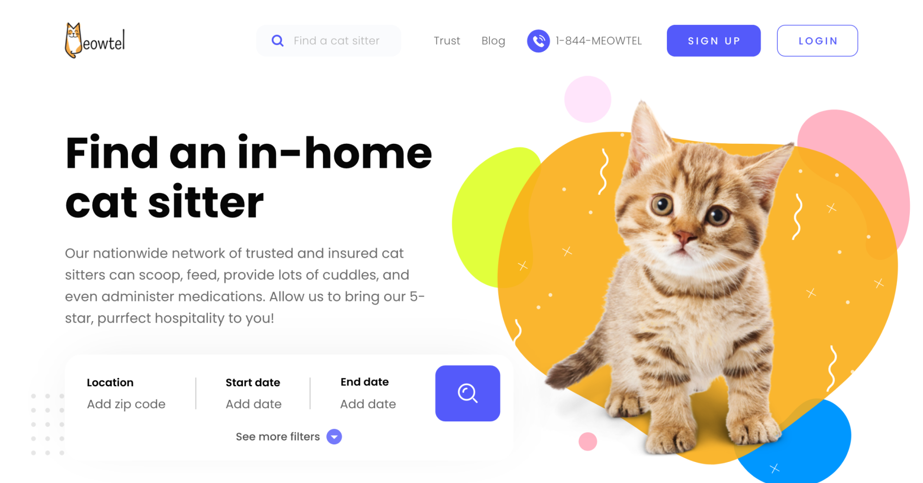 Meowtel is a platform dedicated exclusively to cat sitting, offering cat parents a sense of security and ease when booking quality, insured cat sitters. Meowtel's mission is to help every cat and cat parent live their best life, catering to a target audience of urban, travel-loving cat owners ages 25-44. With a brand focus on trust, convenience, and peace of mind, the platform needed a redesign to increase conversions, strengthen user experience, and highlight the exclusive benefits of Meowtel.
