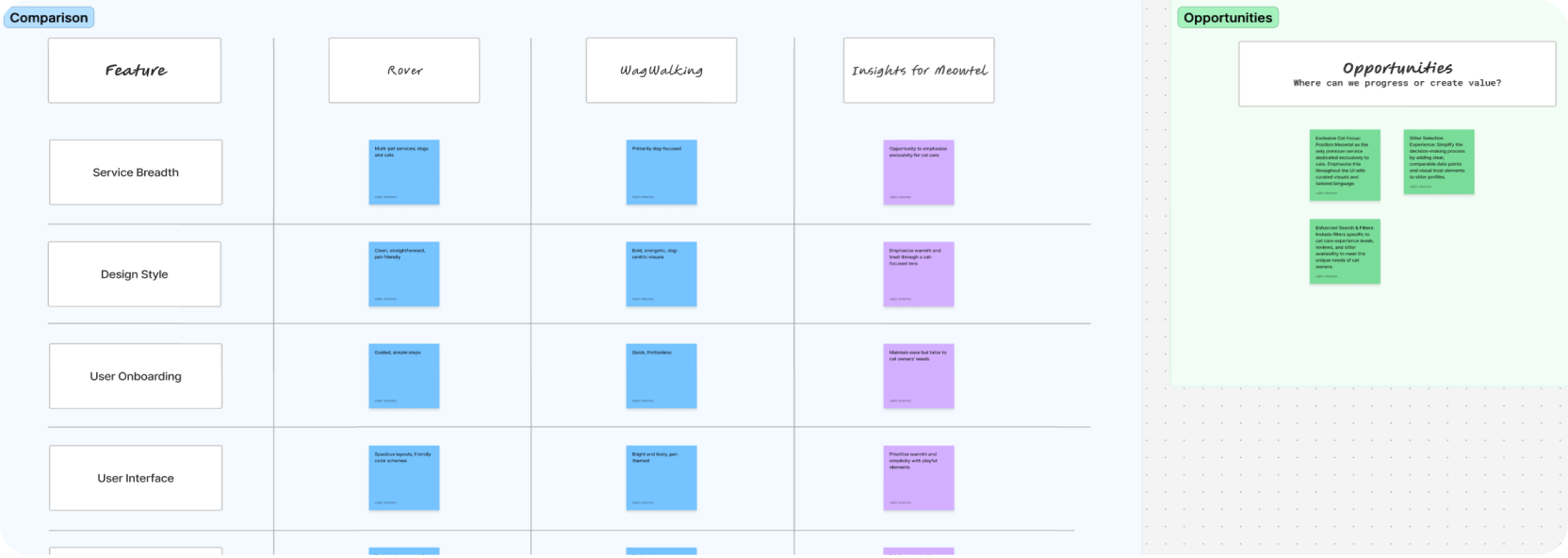 Competitor Analysis: I evaluated platforms like Rover and WagWalking to identify successful design elements and standards in the pet care industry. These insights highlighted opportunities for Meowtel to differentiate through its exclusive focus on cats while meeting user expectations for simplicity and trust.
