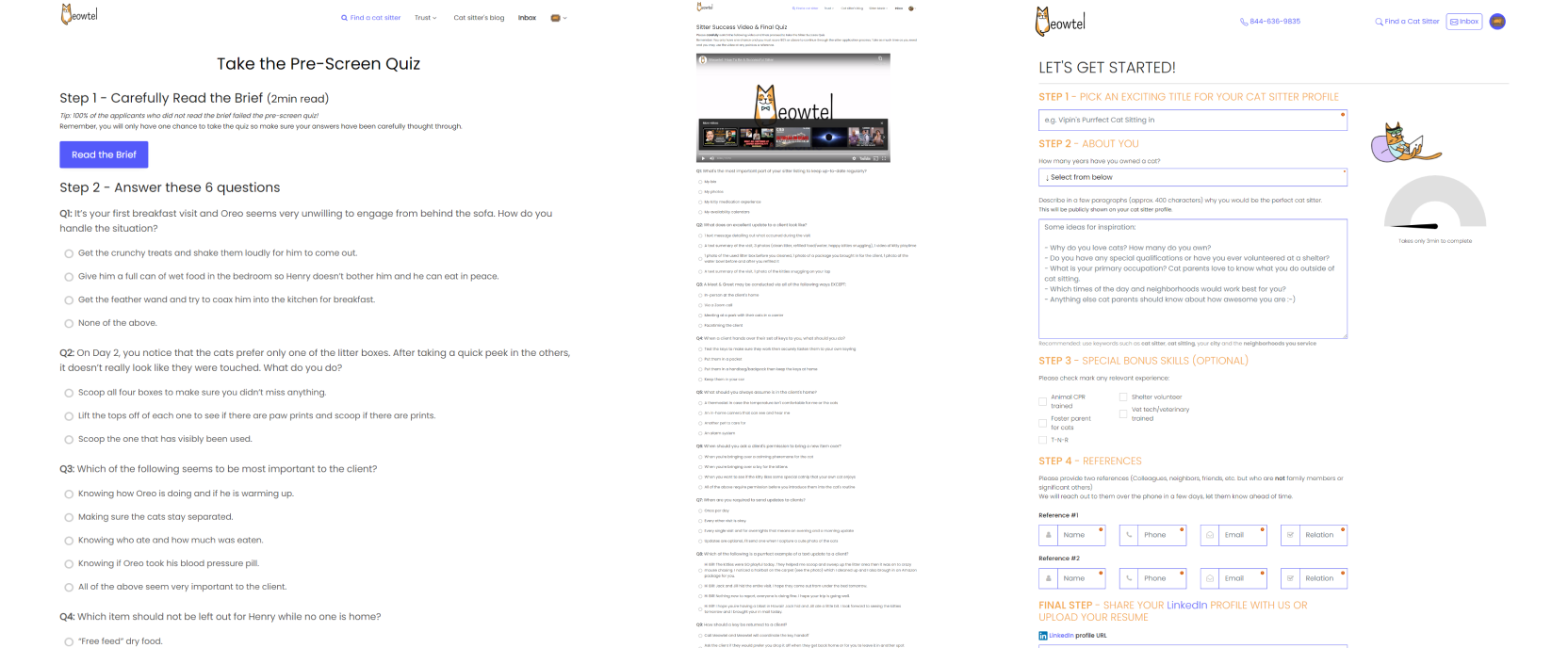 The "Become a Cat Sitter" flow, intended for new sitters, was notably challenging. Sitters had to complete a pre-screen quiz with 6 questions displayed at once, followed by a waiting period, then a final quiz of 20 questions, which added cognitive load and led to friction during onboarding.